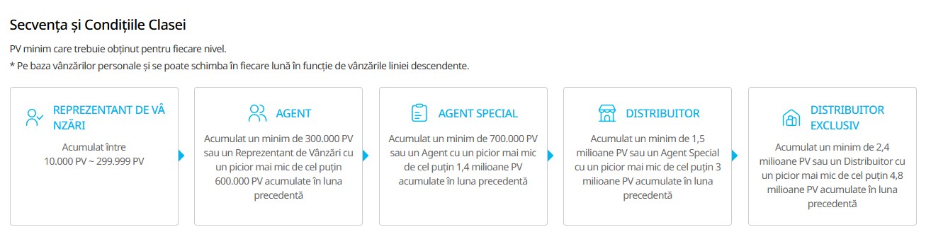 - Clase de dealership: definesc limitele și acumulările în funcție de PV personal și de echipă.