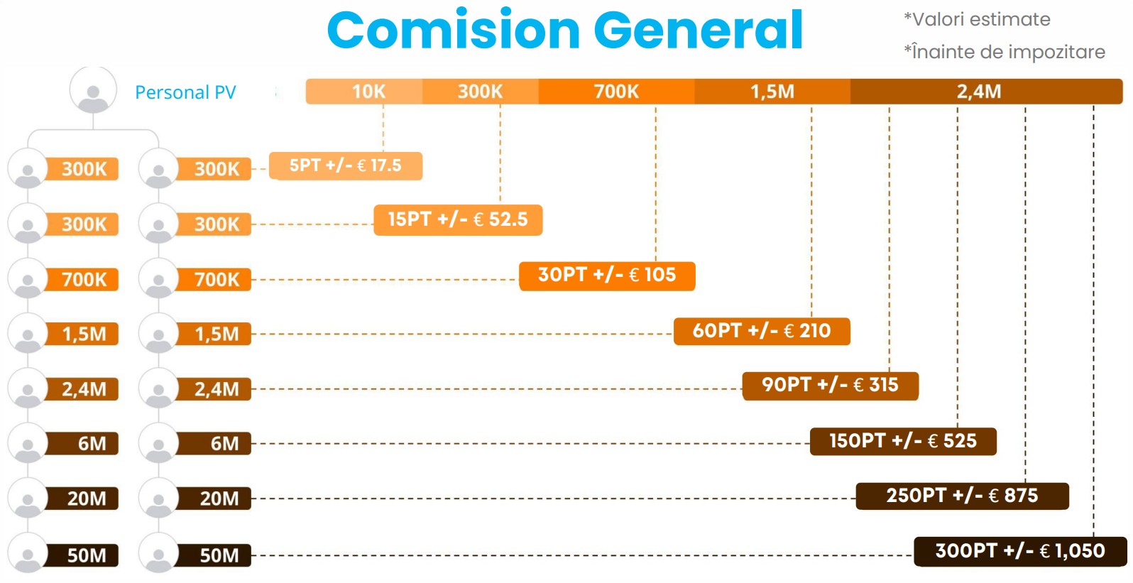 Pentru prima treaptă de comision este necesar, orientativ: minim 10.000 PV personal + 300.000 GPV stâng + 300.000 GPV drept.