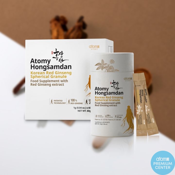 Atomy Hongsamdan oferă 60 de pliculețe cu granule sferice de ginseng roșu coreean 100%, obținute printr‑o tehnologie brevetată care îmbunătățește dizolvarea și absorbțiahttps://eu.atomy.com/product/700107#:~:text=100,GRANULEhttps://eu.atomy.com/product/700107#:~:text=%2A%203,Rg1%2C%20Rb1%20and%20Rg3. Fiecare plic de 1 g conține 1.000 mg extract concentrat de ginseng roșu standardizat la 2% (20 mg/g) ginsenozide, ceea ce depășește doza zilnică recomandatăhttps://eu.atomy.com/product/700107#:~:text=Serving%20Size%201%20Packet%20%280,Servings%20Per%20Container%20%3A%2060https://eu.atomy.com/product/700107#:~:text=Ingredients%20%3ARed%20Ginseng%20,powder%2C%20Korean%20Red%20Ginseng%20Powder. Granulele sunt ușor de transportat și pot fi consumate direct sau dizolvate în apă; se recomandă un plic pe zi pentru susținerea energiei, a imunității și a vitalității. Produsul conține 97% pulbere concentrată de ginseng și 3% pulbere de ginseng și beneficiază de două brevete pentru procesul de granulațiehttps://eu.atomy.com/product/700107#:~:text=%2A%203,Rg1%2C%20Rb1%20and%20Rg3.