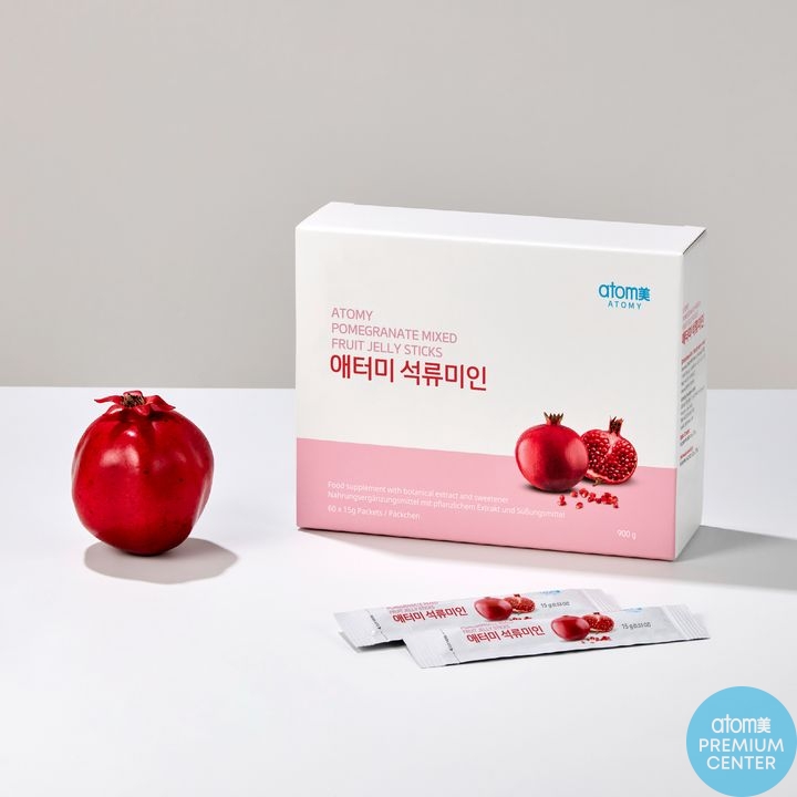 Atomy Pomegranate Mixed Fruit Jelly este o gustare funcțională cu 60 de batoane gelatinoase care combină sucul concentrat de rodie cu fibre și extracte din fructe. Fiecare baton conține 30 kcal și este bogat în acid elagic; pachetul total de 900 g oferă gust dulce-acrișor din rodie, ananas, mango și căpșunihttps://eu.atomy.com/product/700183#:~:text=Product%20Name%20Atomy%20Pomegranate%20Mixed,Storagehttps://eu.atomy.com/product/700183#:~:text=Other%20Ingredients%20%3A%20POMEGRANATE%20JUICE,CHRYSANTHEMUM%20ZAWADSKII. Se recomandă consumul a două batoane pe zi pentru a susține frumusețea interioară și sănătatea; produsul conține, printre altele, isomaltooligozaharide (fibre), ciclodextrină, gume naturale și vitamine. Nu este indicat persoanelor alergice la ingrediente sau sensibile la estrogen și trebuie păstrat într-un loc răcoros și uscathttps://eu.atomy.com/product/700183#:~:text=Caution%20,Storage.